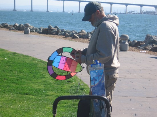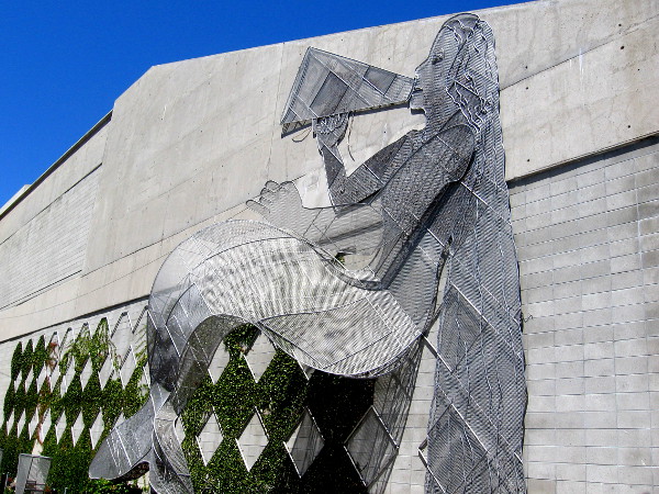 The mermaid, man with binoculars and prismatic kite are all part of public art called The Benefit of Mr. Kite. This fun artwork was created to draw attention to an easily overlooked 925-foot long pedestrian accessway between the convention center and Marriott Marquis hotel, leading from Harbor Drive to the Marriott Marina on San Diego Bay. The artists responsible for our magical journey are Mags Harries and Lajos Héder!