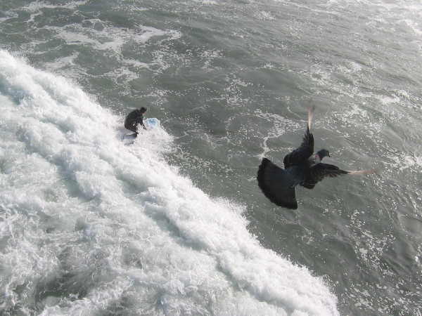 At the Ocean Beach pier’s end you are well out over the water. The ocean-cooled air is inviting, invigorating. The one cooler spot would be straight down, surfing or swimming.