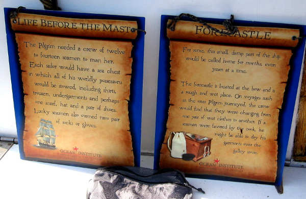 In the shade of a canvas sail, people from the Ocean Institute and visitors chat.Sign stresses the critical importance of correct line handling.Gazing toward the bow past ship’s bell and American flag.The Pilgrim needed a crew of twelve to fourteen seamen to man her.I was one of the first aboard, before the big Labor Day weekend crowd arrived!That fuzzy stuff is called baggywrinkle!Beyond the ship’s wheel, several tall ships are docked at the San Diego Maritime Museum.Advice from the cook–eat good hearty salt beef!
