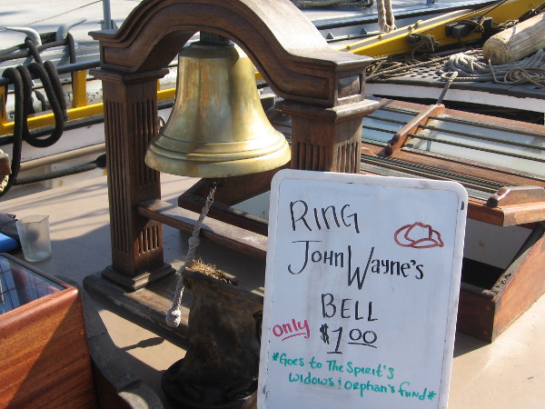 Gaff-rigged schooner Spirit of Dana Point was tied up next to the Pilgrim.Early morning festival visitors check out the Spirit of Dana Point.One of several photographers looking for cool shots on the beautiful ships.This large bell was donated by famous actor John Wayne from his own ranch!