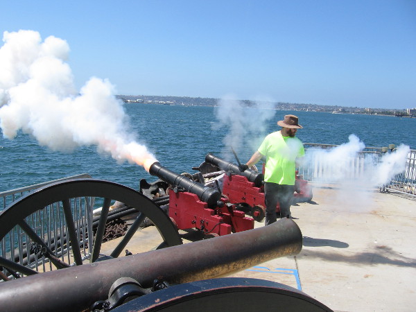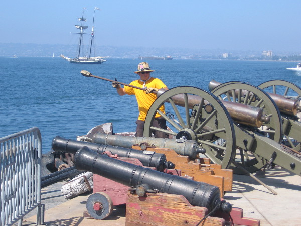 Tall ship Californian fires a cannon toward the Maritime Museum of San Diego during the 2016 Festival of Sail!