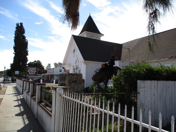 Sculpture of cowboy on bucking horse on grounds of Lakeside Historical Society’s old church. In Memory of Mr. Lakeside Rodeo, Ben Bruton. (As you can see, I walked by around Halloween!)