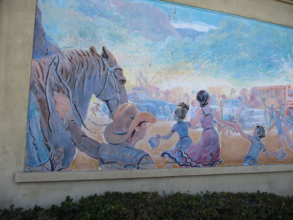 I was stunned at what I found. The beautiful murals include historical scenes from Lakeside. I saw cowboy hats, horses and old cars, and spirited children from another time racing, or near a school bus, heading to or from school. Three panels facing Woodside Avenue show diverse children creating art, performing music and happily living life in the present day.