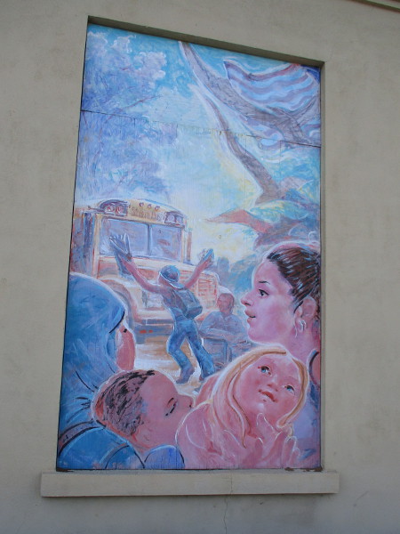 The fading murals were painted on wood boards by artist Mona Mills in 2016. I see that she has produced other indoor and outdoor murals at many schools in the San Diego region. She has also created murals for several East County libraries, which I’ll have to go see at some future time.