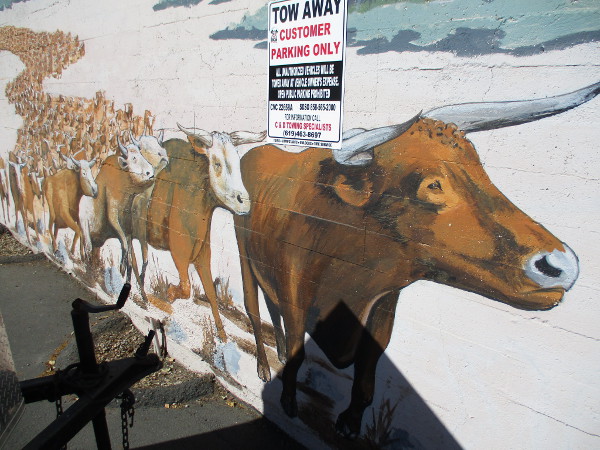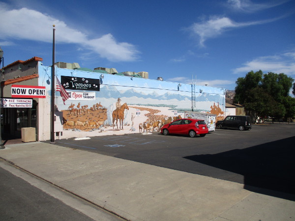 Western cattle drive mural on a parking lot wall in Lakeside. By artist David Ybarra, 2016.