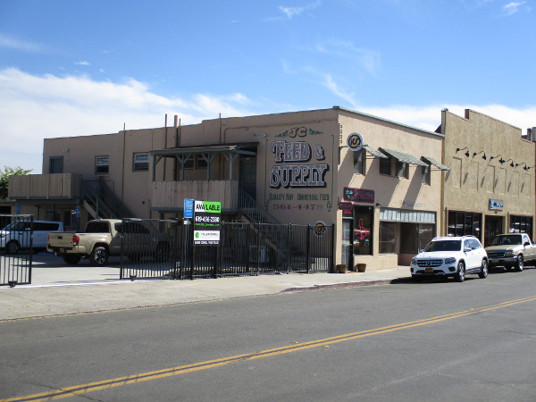 A classic Western scene in front of a small office building.