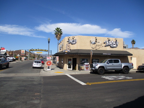 Lakeside landmark sign seen beyond Mary’s Donuts.