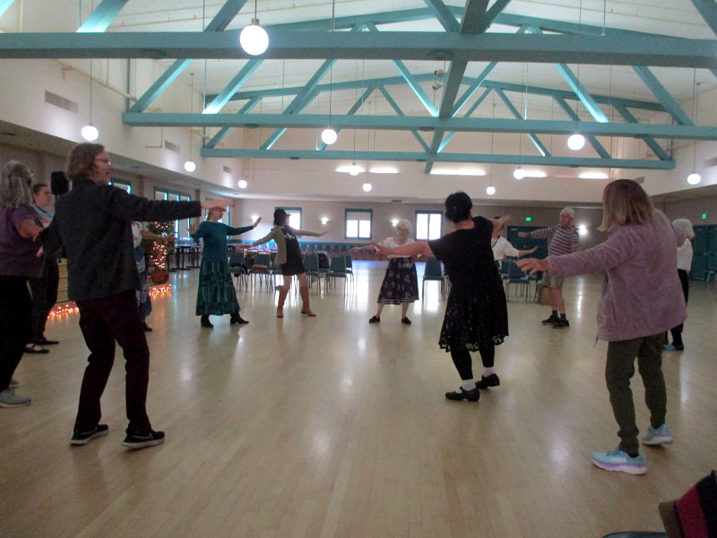 During today’s Dance Festival, which was sponsored by the San Diego Park and Recreation Department and the International Dance Association, folk dancing lessons were provided for beginners. The spacious ballroom was filled with joyful music representing diverse cultures. Several friendly teachers were on hand.