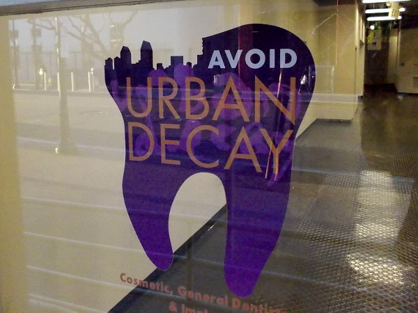 Avoid urban decay. A funny image on the window of a dentist office in San Diego’s East Village.