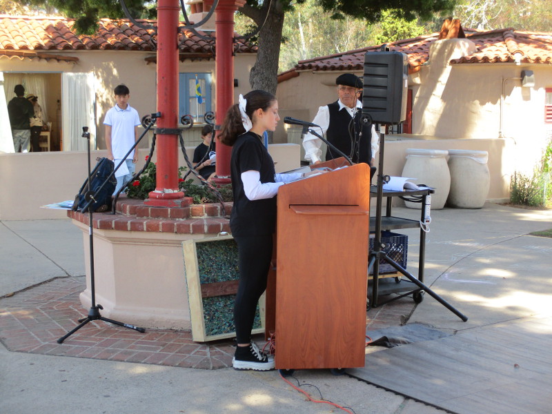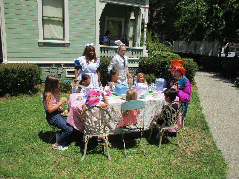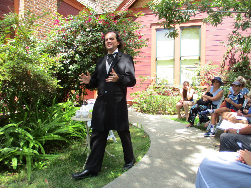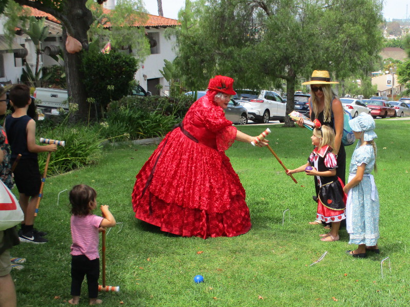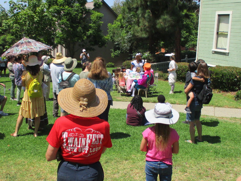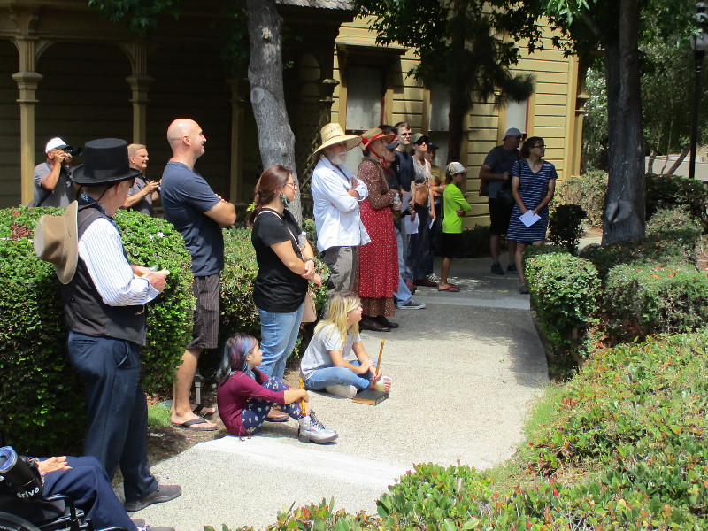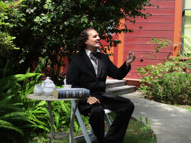 Dressed in Regency attire, members of the Jane Austen Society of North America San Diego Region assembled outside the House of England cottage and listened to beautiful music performed by Amanda Fagan. Many of the ladies were wearing bonnets!