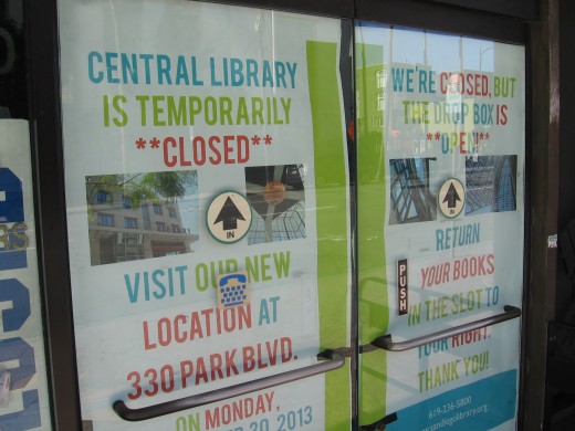 San Diego’s old Central Library on E Street was never really much to look at–in my opinion, at least. It was just a small, nondescript, almost colorless building across from the downtown Post Office. When the brand new gleaming Central Library opened in East Village, the doors of the old library were shut forever. But a few notable images–beautiful works of art near the entrance–still remain.