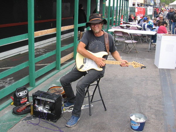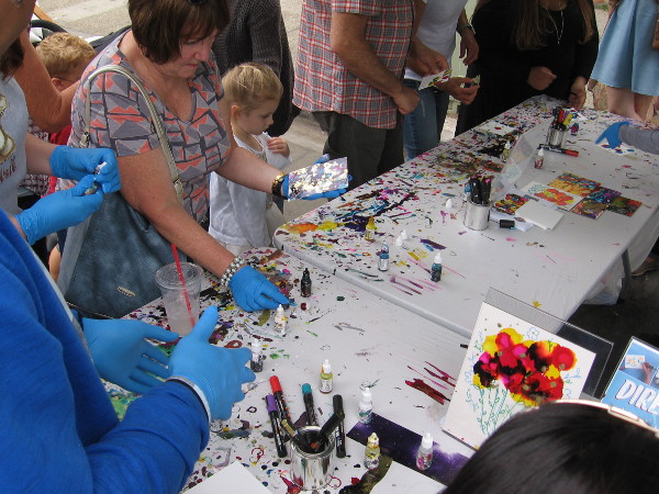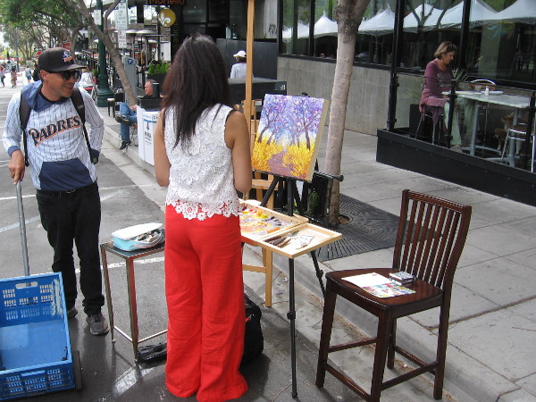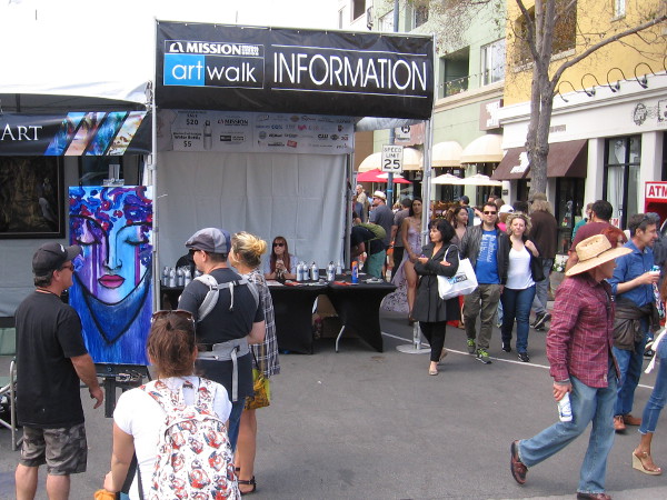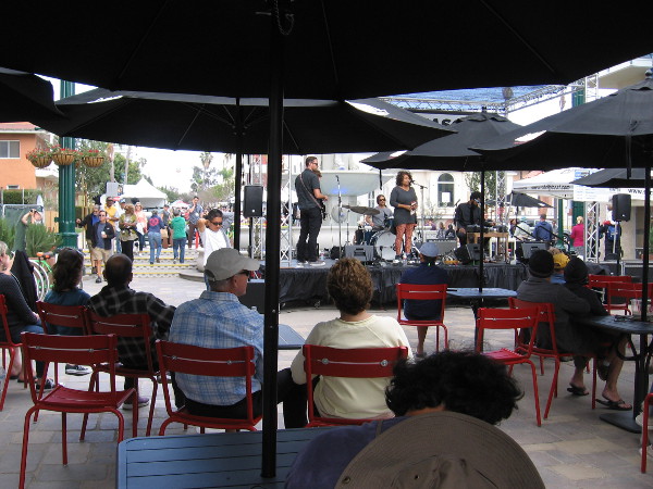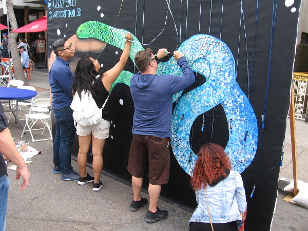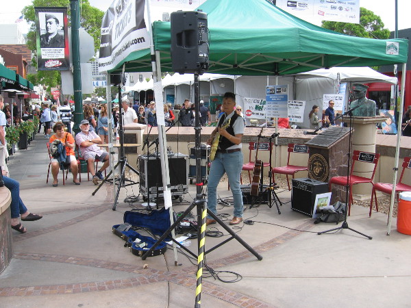 Little Italy’s new Piazza della Famiglia featured a stage plus cool chalk art, which I’ll blog about shortly!Some of the artists were kicking back and talking to potential buyers. Others were concentrating at a canvas creating new work.Little Italy, in downtown San Diego, is a lively place where culture thrives.This guy broke a string as I walked up. He smiled for the camera anyway!People were invited to work on this interactive mural sponsored by Artist and Craftsman Supply.They also had a table nearby for anybody who’d like to create their own art!