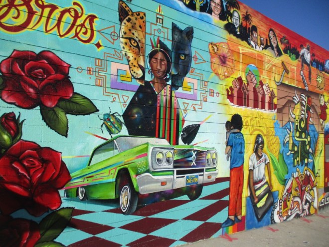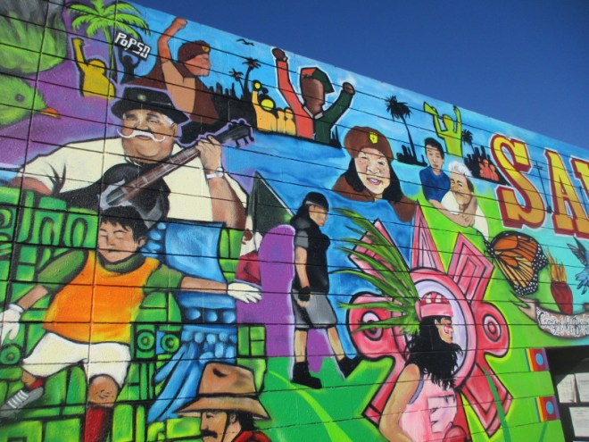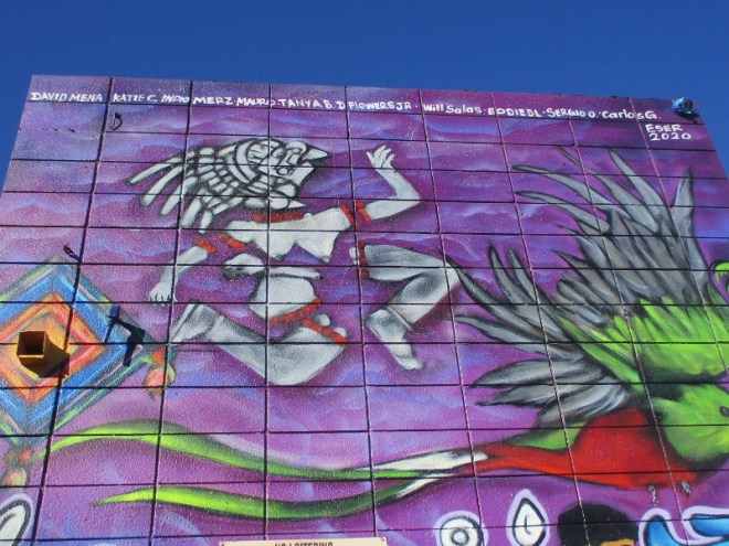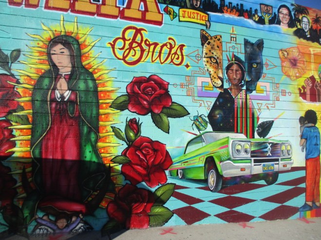 A long fence and gate in Logan Heights was painted earlier this year with characters from the Batman Family and with assorted members of the Batman Rogues Gallery.