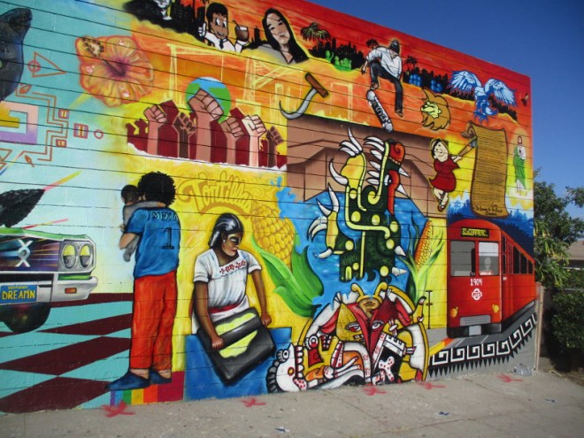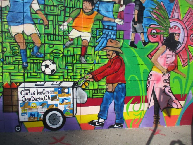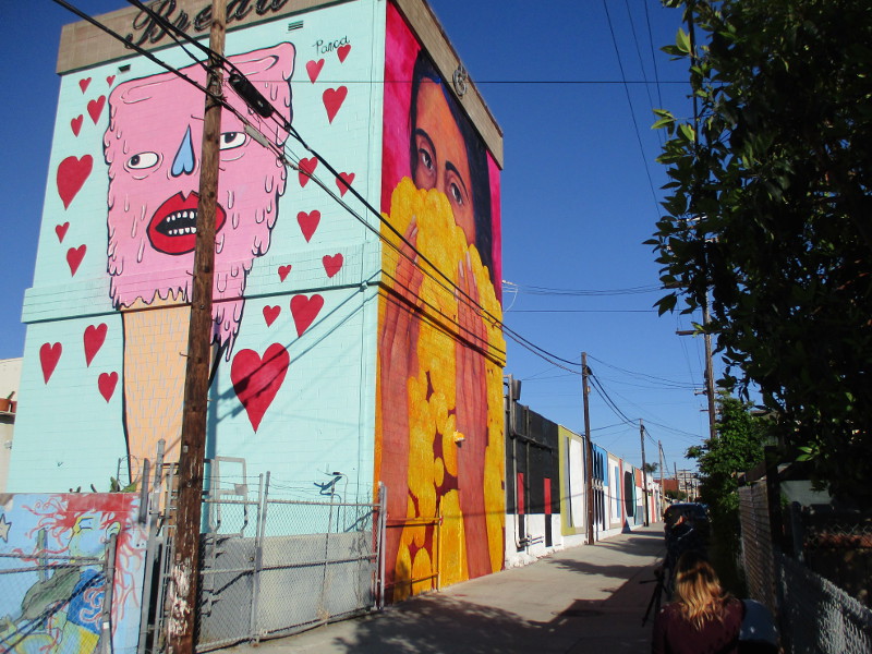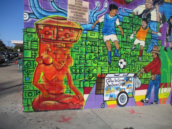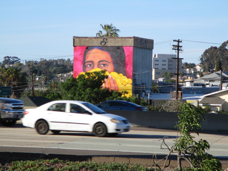 The spray painted artwork is by prolific San Diego muralist Fizix (@alexfizix), whose more ordinary name is Alex Julian.