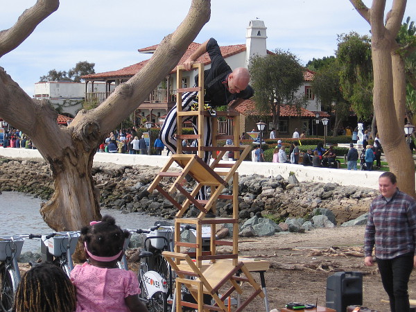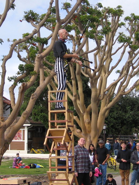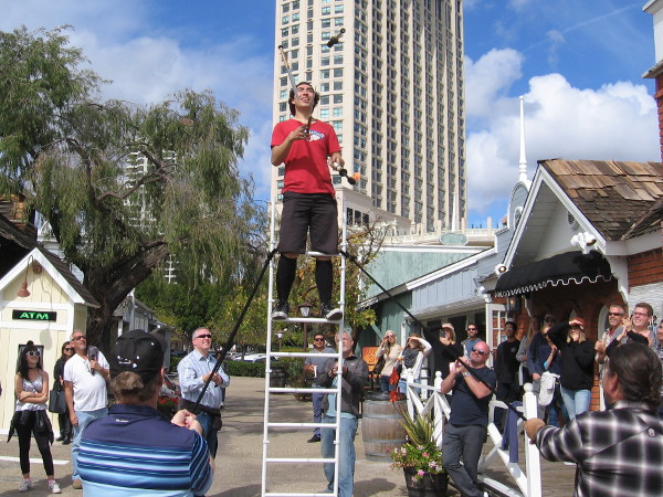 Sam Malcolm, a juggling comedian from Denver, Colorado, performs high atop a ladder during the Seaport Village Spring Busker Festival!