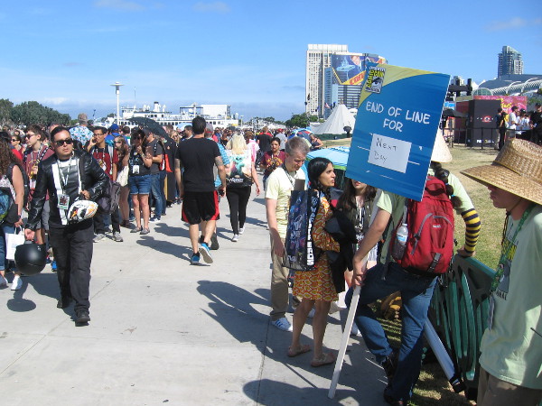 A Star Wars stormtropper holds a humorous sign. Support the Troops.Long morning lines wrapped this way and that, but nobody seemed to mind.Cedric Diggory cosplay. An early glimpse of magic.Some cosplay pooches are part of the big spectacle.These Wonder Women made cool superhero skirts out of old Justice League swag bags!Good thing Nick Fury called Captain Marvel. Here she comes now to save the day!These zombies paused for a photo at the foot of the steps up to the convention center.I was told this cosplay is Bird Person.Check out this awesome cosplay! It’s Fire Archangel Velajuel, a Summoners War Sky Arena Monster.I was told this funny cosplay is Pac-Gentleman.Lots of visitors to 2018 Comic-Con were checking out the Bandai Dragon Ball activation.Vegeta cosplay.Mario and Luigi prepare for battle.I was told this cosplay is Radioactive Man.That’s my kind of superhero. One who brings ice cream! Who needs a utility belt?Cyclops was good enough not to remove his visor. The ice cream might melt.Amazing cosplay of some Mad Max post-apocalyptic characters.Hopefully Kylo Ren does me in before I have to witness another one of his ridiculous temper tantrums.At the FOX activation for The Passage, a scientist in a white lab jacket shows me the first human to be resistant to all known diseases. Unfortunately he has to drink human blood.Rorschach cosplay. Somehow using his lips he could make the inkblot on his mask change appearance.Some poor guy is caught between a fight between Peter Griffin and Ernie the Giant Chicken.A look at the FXhibition area near the Hilton Bayfront, behind the San Diego Convention Center.Another look. It’s late Saturday morning at 2018 Comic-Con.People place their heads in Archer character cubes for an unusual photo opportunity.Here’s Camp Paddy’s outhouse.Now that’s one very bizarre photograph being taken.Zatanna cosplay. Magic is her specialty.She must have waved her magic wand, because there’s wonderful cosplay all over the place!A cool FX guy poses beside a Mayans MC motorcycle for my camera.Mera blinked. Must be all that dry air above the water.Chillin’ at the FXhibition.Magicians perform, delighting young and old alike. There’s endless magic at Comic-Con!