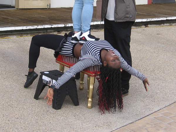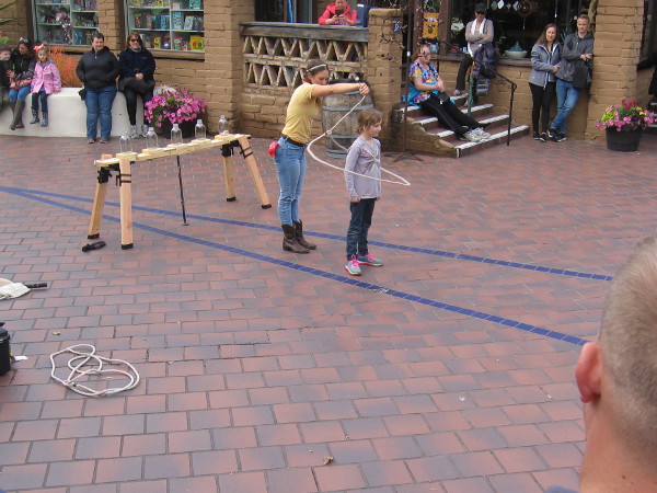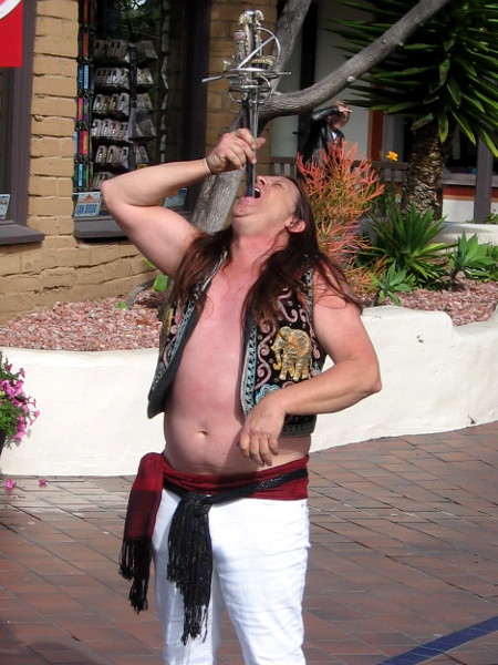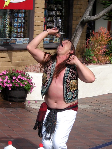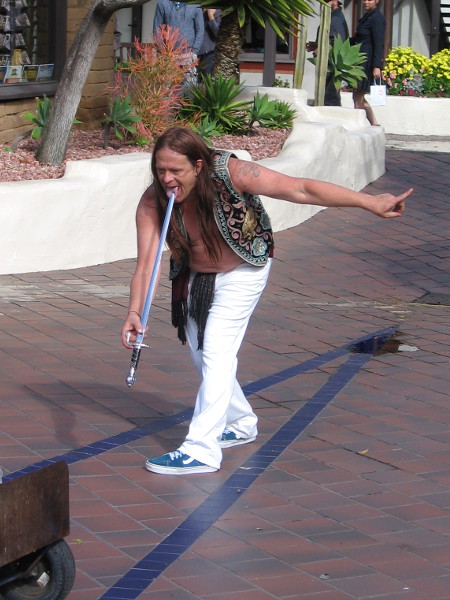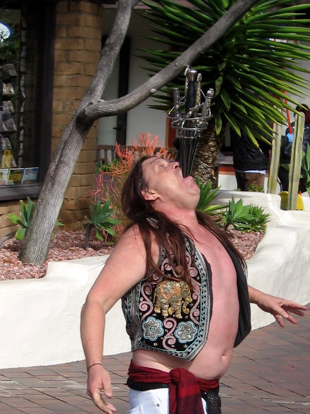 Even with the drizzly, breezy winter weather, people came out to Seaport Village on Saturday to watch some of the best street performers in the world.Daniel Israel juggles while high atop a unicycle!Cate Flaherty is a professional circus acrobat with a big smile. Her juggling and balancing performance was great!George Gilbert entertains people by the water. For a grand finale, he magically made a pineapple appear under his hat!Nolan Webster included a lot of humor in his parlor magic show. That ball was actually attached to his nose! Cheater!The audiences at the Busker Fest were all smiles.Kids seemed to have the best time while the buskers performed. Many adults were very shy.Murrugun the Mystic calls an audience together near Seaport Village’s central fountain before beginning his amazing two-part act!Murrugun’s first act is a series of fantastic fire breathing and eating tricks, including shooting flames out of his mouth! He performed to one side, out of the wind.The second act was sword swallowing. Murrugun the Mystic is one of very few true sword swallowers in the world.That’s a genuine, long and very sharp sword poised on Murrugun’s tongue.Here we go!When all the way in, the sword has penetrated between his heart and lungs and ends at the bottom of his stomach, just below the belly button!Next comes a sword sandwich–six swords carefully aligned together. Over the decades, a scary number of performers have died doing this dangerous sword swallowing trick. Murrugun himself was once seriously injured.That’s a lot of sharp steel to swallow!In go six genuine swords!One of the most amazing human spectacles you’re likely to ever witness!Back near the water, Jonathan Strange was doing some mystifying ring linking magic with an assistant chosen from the audience.Molly Keczan includes lasso rope tricks in her fun The Farmer’s Daughter Show.The Farmer’s Daughter keeps balance as she walks along the top of glass milk bottles–with one good eye! A wildly successful show, in spite of her contact lens difficulty!While walking around I spotted Martika Daniels setting up for her act with a big smile.Martika’s amazing show included being stood upon while lying on a bed of nails!Ouch! Martika explained that stunts like this make some of life’s difficulties seem small by comparison. Her show was super positive and inspirational!Another awesome sword swallowing act!Buskers and audience members all seemed to have a great time, even if the San Diego weather didn’t cooperate today!