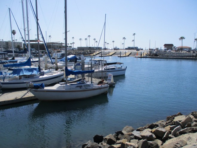 Descending Harbor Drive to beautiful Oceanside Harbor.Looking past Joe’s Crab Shack and boats in the South Harbor marina toward the picturesque lighthouse.Across from the Oceanside Harbor boat ramps, which we’ll see close up later in the walk.Turning north, walking past the Oceanside Broiler restaurant, where diners sit outdoors gazing at boats in the Southern California sunshine.Many benches along Oceanside Harbor are dedicated to loved ones, or feature inspirational messages.Monument to Erwin Sklar, 1910-1974. During his term as Mayor and City Councilman this harbor was designed and built, fulfilling a Dream of Erwin Sklar and the People of Oceanside.Small boats pass stand up paddleboarders near the entrance to Oceanside Harbor.Watching activity on the water from the end of the Oceanside Harbor Fishing Pier.Monument by the Oceanside Harbor Fishing Pier. Remember Pearl Harbor.Fishermen wait patiently for a bite on the pier. I was told many types of fish can be caught here, especially when the water warms up later in the year.A large ship’s anchor with a small plaque across from the entrance to Oceanside Harbor.In memory of those lost at sea. Dedicated January 9, 1979.Along North Harbor Drive, large blue and white letters spell OCEANSIDE.Many along the boardwalk were watching Sea Lion Island, where there appeared to be a lot of napping.Sea lions relax in the Oceanside sunshine.A better view of the OCEANSIDE sign, which is visible to boaters entering the harbor.Continuing the walk, now along the North Harbor.People pass me on the boardwalk carrying a kayak.I pass the Oceanside Weighing Station. No fish being weighed at the moment.The Jolly Roger restaurant across the North Harbor.Kayaks stacked on the nearby dock.Right around here I turned about to retrace my steps.Back by Joe’s Crab Shack. The walk now proceeds in that direction.People walk out onto the docks.Some sportfishing vessels can be boarded nearby.Approaching shops and restaurants and other touristy attractions of the New England-style Oceanside Harbor Village.Sportfishing and whale watching trips are available at the Oceanside Sea Center.A great view from up there.I like this mail box!Interesting photo of the red and white faux lighthouse, which is actually home to Lighthouse Oyster Bar and Grill.Lots of beachy souvenirs attract passersby.Looking back at the lighthouse and Oceanside Harbor Village.We’ve arrived at North Pacific Street, which runs between the harbor and the beach.Heading north again, but on the west side of Oceanside Harbor.We’ve come to the boat ramps, which are very active on a sunny weekend day.Marker at the Oceanside Harbor Boat Launching Facility.Curtis Landing, dedicated September 17, 2005, honors two people named Curtis. Jon W. Curtis was a harbor police officer hero. Joe V. Curtis contributed as a community leader.Photo taken across the harbor from beside the boat ramps.Another photo.Continuing north.Kites were flying near the harbor entrance.I’ve turned west and am heading toward the jetty which protects Oceanside Harbor from the Pacific Ocean. In the distance past a sailboat you can see the Oceanside Marina Suites.A right turn on the water leads to Camp Pendleton Harbor’s boat basin.That sailboat we just saw is now entering the harbor.Near the foot of the T-shaped jetty. The beach is on the left.People by the shining Pacific Ocean.And to the south, far beyond this surfer on the beach, juts the long Oceanside Pier.