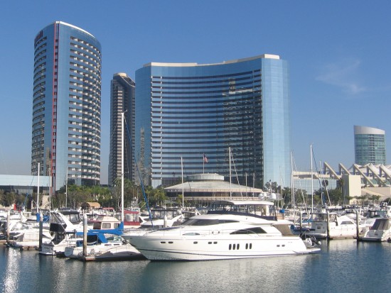 Visible in this photo, taken from the walking path at the south end of the Marriott Marina, are two prominent hotels on San Diego’s picturesque waterfront. To the left is the elegant Manchester Grand Hyatt, and in the center are the two curved, shining, sail-like buildings of the Marriott Marquis. On the far right you can see the north end of the long San Diego Convention Center.