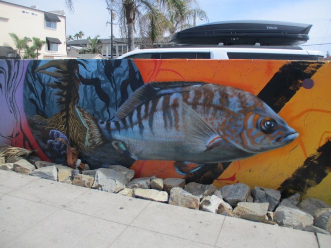 Last June this beautiful environmental mural was painted in Pacific Beach. You can find it on the west side of Mission Boulevard, a block south of Grand Avenue. (It’s on a wall next to the anti-cigarette butt “Bunny Kitty” mural by Persue that you can see here.)