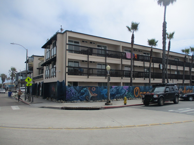 Beautiful murals depicting sea life surround the base of the Ocean Beach Hotel and its parking lot. Painted this year by local artists Carly Ealey and Christopher Konecki, the artwork stretches along Newport Avenue and Abbott Street.