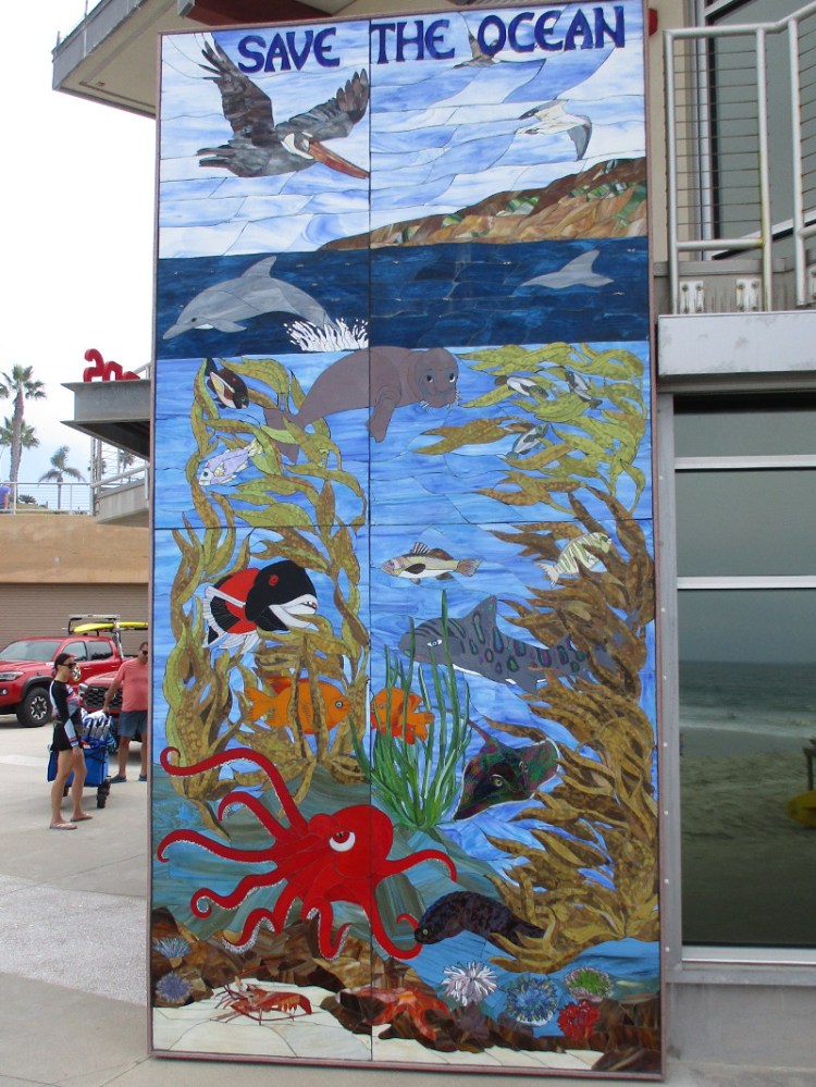 The stained glass shines brightly in the Southern California sunshine. The words SAVE THE OCEAN crown colorful images of sea life. This inspired public art makes Moonlight Beach even more special.