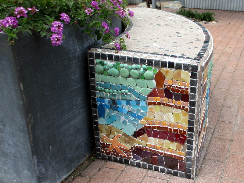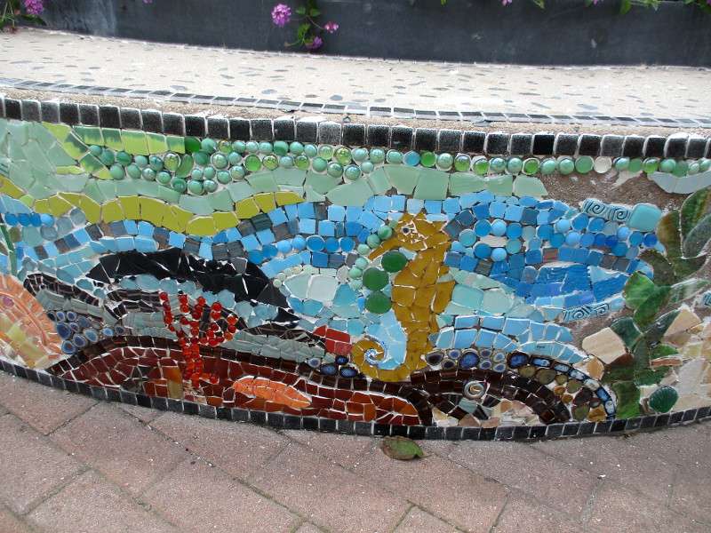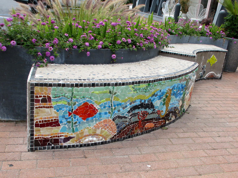 This bench decorated with tile mosaics adds beauty to the edge of a parking lot south of the Belly Up Tavern in Solana Beach.