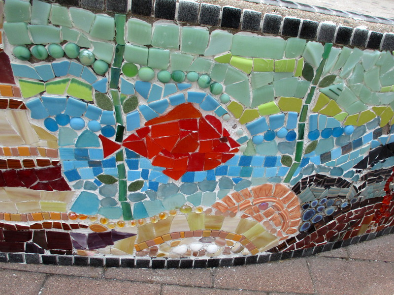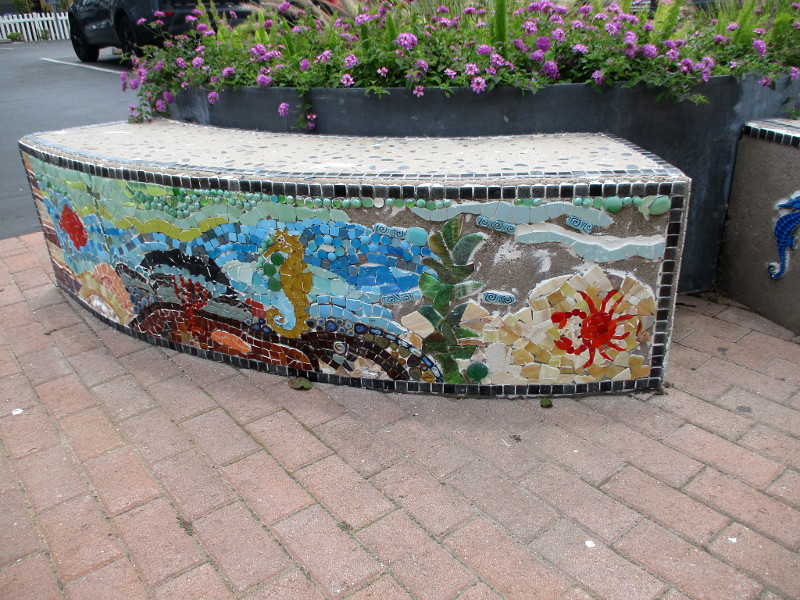 I believe I see a starfish, garibaldi, seahorse and crab. The curving bench appears to show an underwater ocean scene. What do you see?