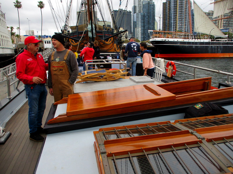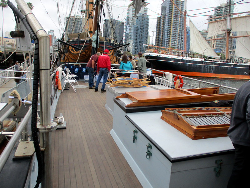 Up some steep steps and we’re back out on the main deck. That is HMS Surprise of the Maritime Museum of San Diego straight ahead, and their iconic Star of India–oldest active sailing ship in the world–to the right.