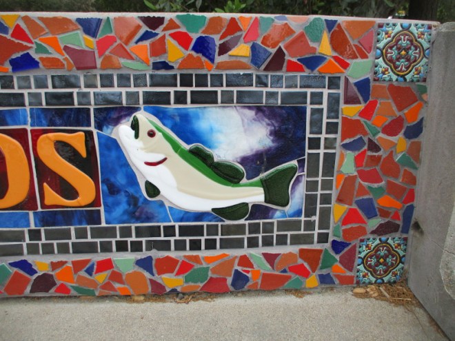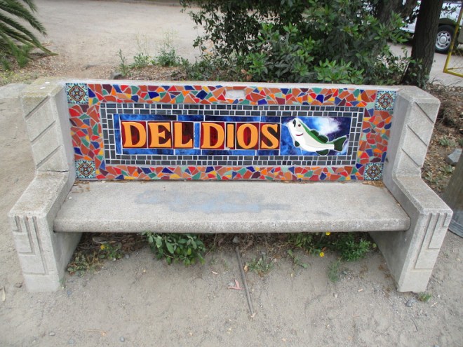 Before walking along the San Dieguito River Trail on Saturday, I checked out some colorful old artwork painted on the side of Hernandez Hideaway. Then I noticed a really cool “Del Dios” tile mosaic bench across Lake Drive at the North Shore Lake Hodges Trailhead.