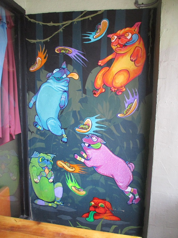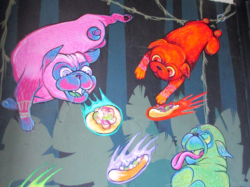 Fridas Street Tacos on Valley Parkway is the perfect place for this great mural, painted by Michelle Ruby, aka Mr B Baby. The taco shop’s parked vehicles were blocking the mural when I walked by, so I had to take photos around and between them.