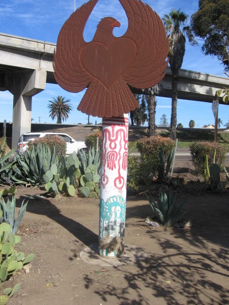 Primitive frame made of bent branches.Flower sculpture and cacti beside freeway.Colored stones ring a painted cactus in Chicano Park.Sculpture stands among the surrounding murals.Small mural near pedestrian walkway that crosses freeway.An eyeful of bright colors everywhere you turn!A monument to the sacrifices of Hispanic veterans.