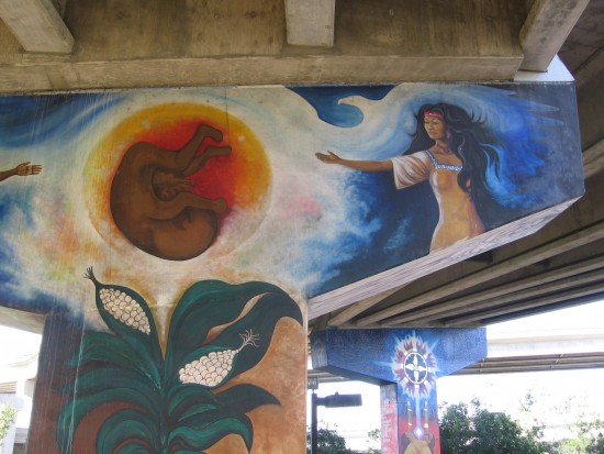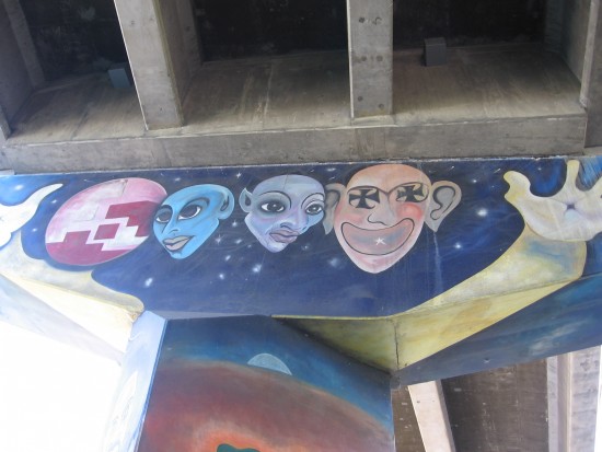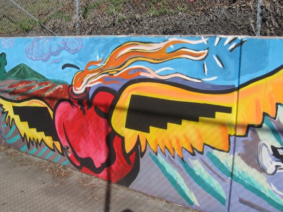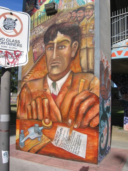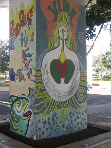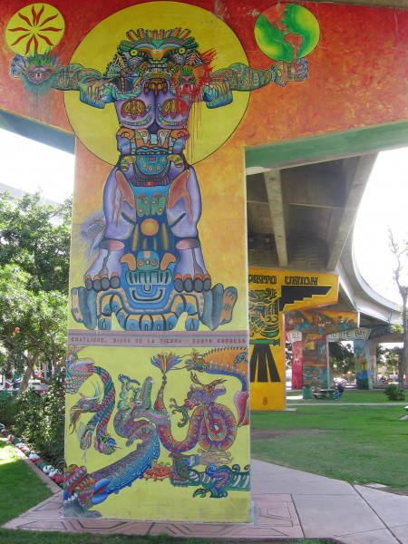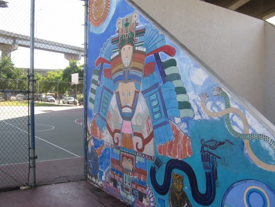 The mural featured here is a very long one. It’s painted behind the park’s fenced basketball court, on a low wall that borders Interstate 5. Like the other public murals in Chicano Park, it’s a colorful hodgepodge of figures and symbols that seem to share one general theme: Mexican American pride and empowerment.