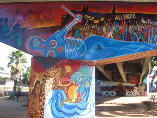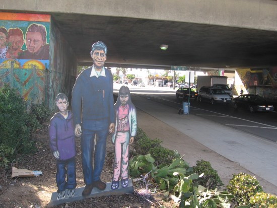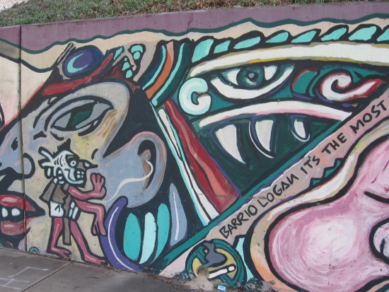 Raza mural decries Operation Gatekeeper.Cesar Chavez Blvd mural under busy freeway.Arriba Mexico on I-5 underpass mural.A painted Cesar Chavez and two youth greet traffic in Barrio Logan.Aztlan mural on Cesar Chavez Boulevard.Pedestrians near Chicano Park walk past public art.Mural at edge of Chicano Park opposes retrofitting.Painted images on Interstate 5 north of Chicano Park.Utility box painted with El Corazon, the heart.Mural supports Race, opposes the Border Patrol.Elaborate mural containing ancient symbolism on a handball court in Chicano Park.Painted jaguar crouches near basketball court.A very detailed and colorful mural in Chicano Park.Aztec mural painted near chain link fence.Utility box with colorful figures, including a mariachi.Classic cars depicted on a concrete pillar.San Diego Lowrider Council mural in Chicano Park.