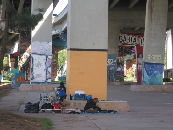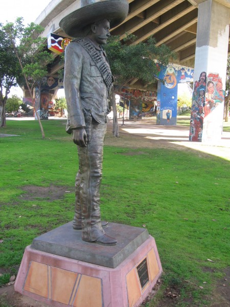 Mural makes political statement about immigration.Zapata quote in a high nook.Chicano Park mural shows immigrants working in fields.Elaborate Aztec figure painted on concrete pillar.Various colorful images on a wall in Barrio Logan.Broom leans up against mural of students in school.Virgin Mary and shrine at foot of Chicano Park mural.Murals under lanes leading to Coronado Bay Bridge.Central dance pavilion in Chicano Park.Ceiling of dance pavilion shows natives from Tenochtitlán.Female figure on beautiful ceiling of dance pavilion.A series of murals on pillars supporting traffic lanes.Bronze statue of the Mexican revolutionary soldier Emilio Zapata.Spanish poem in Chicano Park about dancing and life.A variety of creative and amusing images.Aztec warrior and shield stand guard in San Diego.People walking through Chicano Park.All The Way To The Bay refers to 1980 Chicano Park campaign.Diverse people on a very detailed mural.Faces tell many stories in Chicano Park.Cool green masked figure.Brilliantly painted park structure near playground.Wide view under Coronado Bay Bridge reveals murals and sculptures.Environmental message on Barrio Logan mural.Mural protests toxic waste from nearby shipyards.Historical figures come alive in Chicano Park.Artwork provides a strong warning.Dynamic shapes, figures and bright colors.Bold face shows strength.Second beautiful female face.Third female face is an excellent piece of art.Fourth female face on Chicano Park pillar.More amazing artwork in the famous San Diego park.Aztec warriors come alive in Chicano Park.Abstract plant-like painting appears symbolic.Mattress of homeless person leans up against painted utility box.More colorful artwork.I Bend Like Desert Flowers Do.Please do not throw litter in the fountain.Fantastic metal sculpture in tiled fountain.Kid plays behind neglected art under Coronado Bay Bridge.Painted bases of pillars supporting the bridge.Two vibrant abstract faces.Many who are homeless camp out in Chicano Park.A world of murals can be found in Chicano Park.