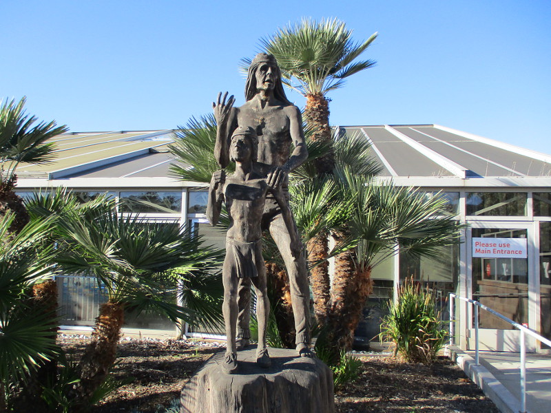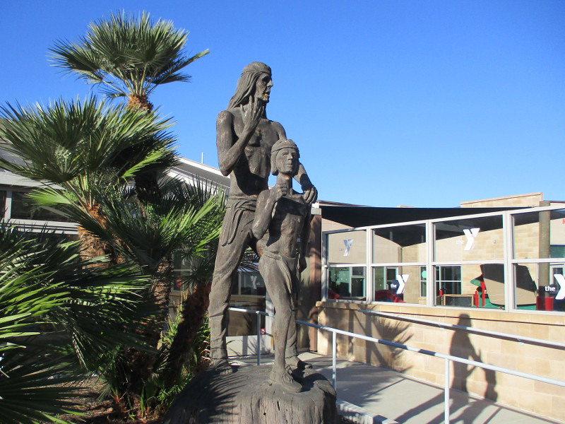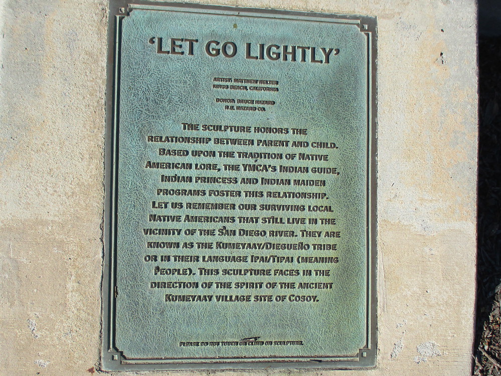 The sculpture honors the relationship between parent and child. Based upon the tradition of Native American lore, the YMCA’s Indian Guide, Indian Princess and Indian Maiden programs foster this relationship. Let us remember our surviving local Native Americans that still live in the vicinity of the San Diego River. They are known as the Kumeyaay/Diegueño tribe or in their language Ipai/Tipai (meaning people). This sculpture faces in the direction of the spirit of the ancient Kumeyaay village site of Cosoy.