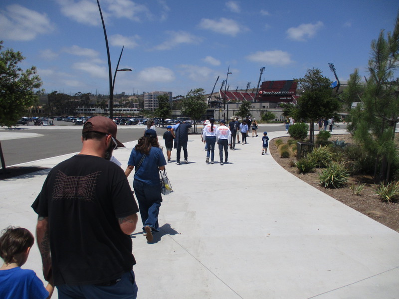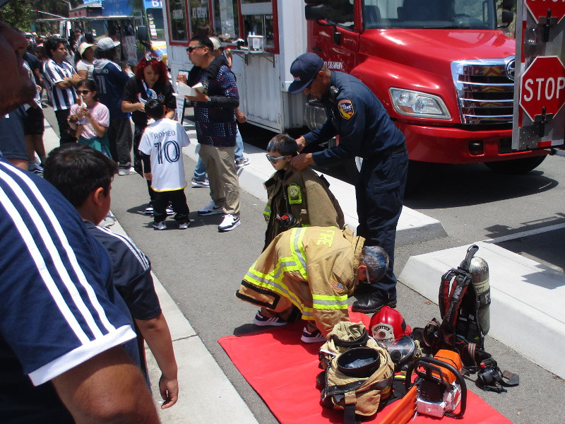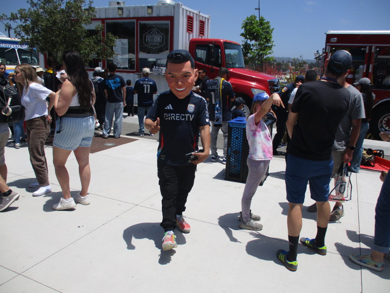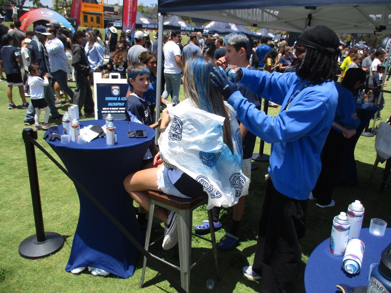 Heading toward Snapdragon Stadium from the nearby trolley station.DIRECTV is a major partner of San Diego Football Club.Kids kick a soccer ball around on the grass.This smiling lady was creating soap bubbles earlier!Fans were posing for photos all over the place.Big crowd ahead!Many fans were in line for the team Meet & Greet.The FanFest includes food trucks and picnic tables.I think this guy is supposed to be SDFC Forward Hirving “Chucky” Lozano!Kids find out what it’s like to be a firefighter.Many fans were getting SDFC haircuts!These guys will look very stylish.Dedicated SDFC fans could also have their hair colored.Chrome and azul are San Diego FC’s team colors.Just “kicking it” at the pre-game party!