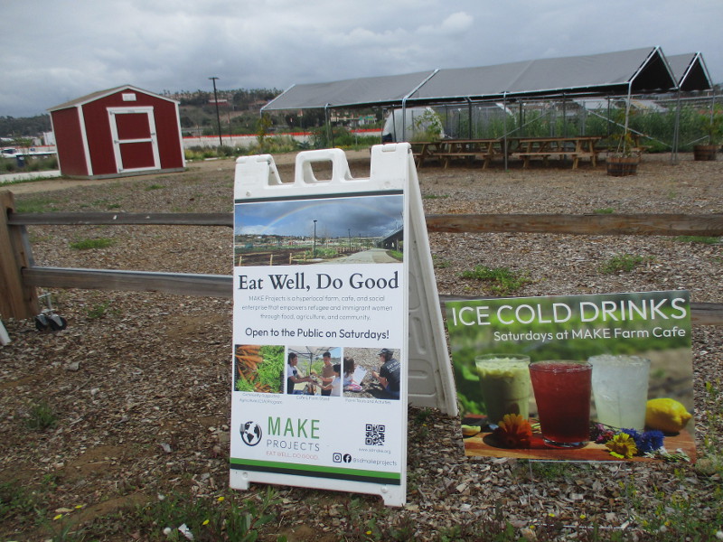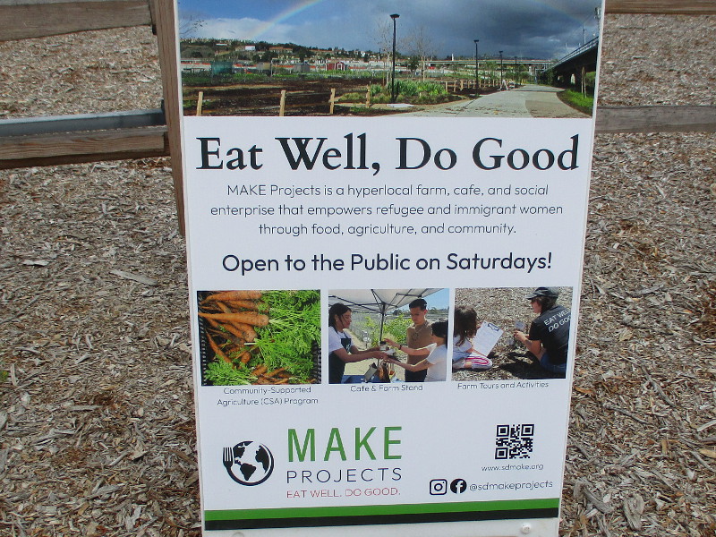 MAKE Farm is located immediately south of the large Snapdragon Stadium parking lot, a little east of the Stadium trolley station. According to signs I spotted today, their offerings include Garden Veggie Wraps and Yogurt Parfaits, and you get a free cookie during your visit, too!