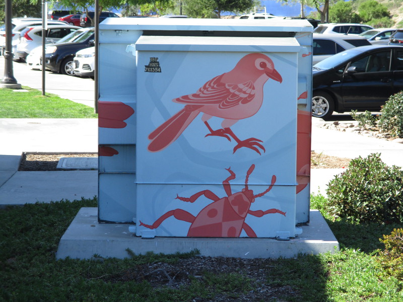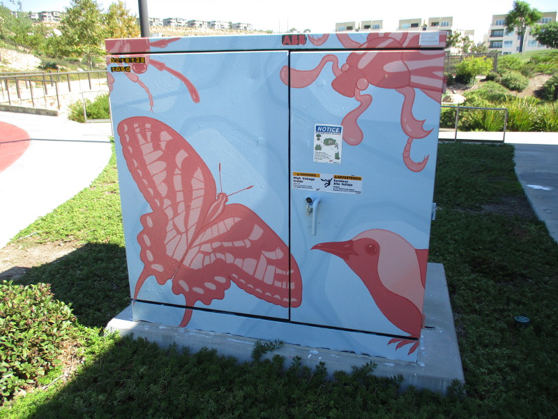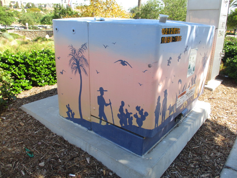 This large old mural was painted on the south side of the Hazard Center shopping center in 1996 by an artist whose signature is Duff. The artwork faces the San Diego River and is exposed all day long to the sun.