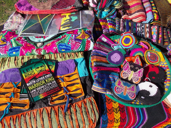 Folks were at the San Diego Multicultural Festival in Ruocco Park listening to lots of great live music.This smiling lady representing the WorldBeat Cultural Center in Balboa Park had a table full of beautiful crafts. They’ll be having a Let Freedom Ring event on MLK Day.Super colorful art and wares at the WorldBeat table. Celebrating life, diversity and Martin Luther King Jr. Day in San Diego!People were enjoying drumming on the grass in Ruocco Park, near Seaport Village.This cool musician on the stage saw me taking a photo! Hello!