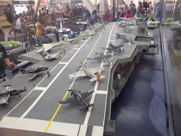 I like to check out this cool sight whenever I’m at a Padres baseball game or some other event at Petco Park. (It reminds me of when I was a kid, assembling a variety of small airplane models, gluing together the plastic pieces, carefully applying daubs of paint.) Young people today who wander through the stadium’s Power Alley can test their arm at a fast pitch game, enjoy a hot dog, then perhaps peer through the glass at the many aircraft arranged on the Midway’s flight deck.