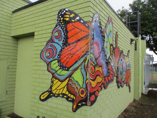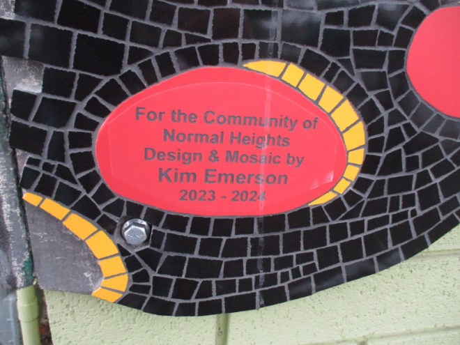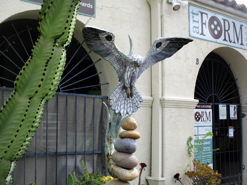 According to a sign, the work is being done by Lech Juretko. He operates Art Mosaic Inc. in Santee. For eight years he was an assistant to Niki de Saint Phalle, helping to produce 100 of her works!