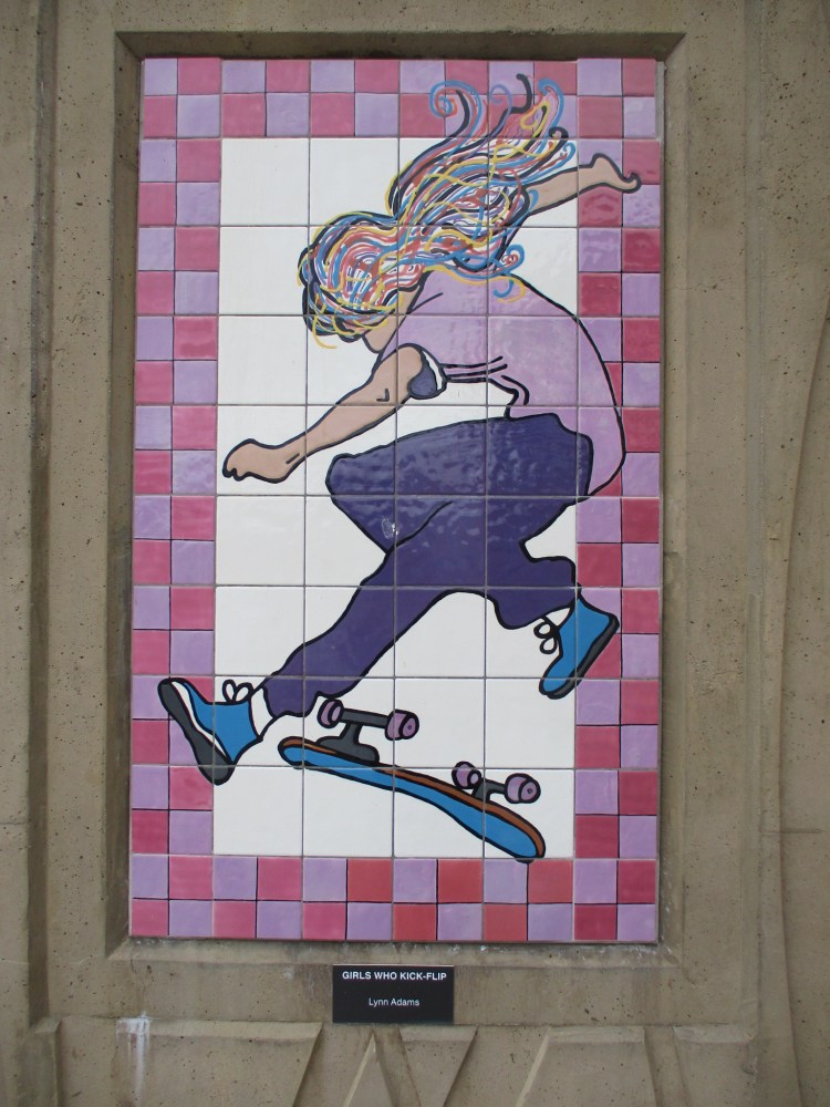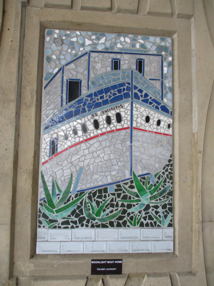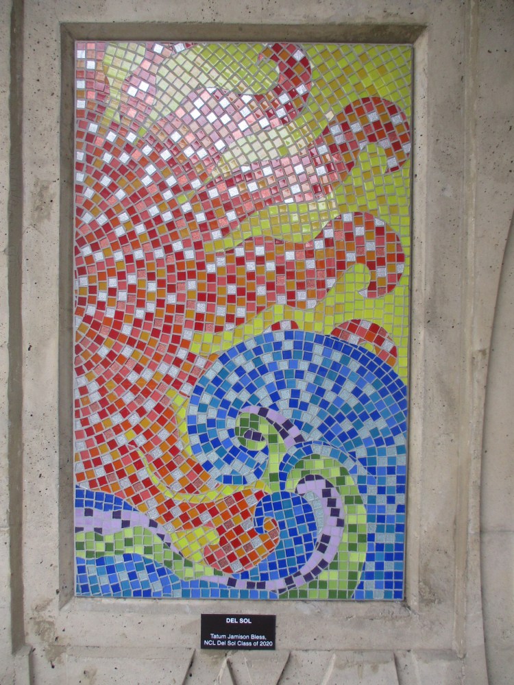 The first medallion you see in the above photograph can be found a very short distance west of the Stadium trolley station. The image represents Basket rush (Juncus textilis). It’s where our two mile walk will begin.