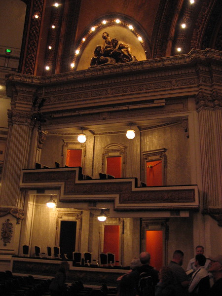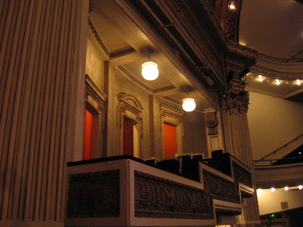 Our group was provided with all sorts of cool information, but sadly I didn’t write it all down. We did learn that the Spreckels Theatre and the building that it’s housed in was built by San Diego entrepreneur and philanthropist John D. Spreckels, and was designed by Harrison Albight. The structure is built of concrete and steel–it actually contains more steel than nearby modern high-rises. The Grand Lobby outside the theatre entrance contains a vast quantity of beautiful onyx that was shipped in from Mexico.