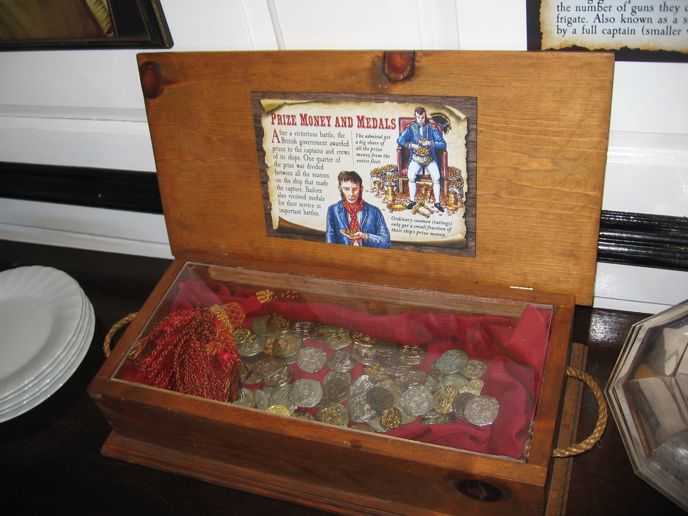 A display in the great cabin concerns prize money and medals. After a victorious battle, captains and crews were rewarded by the British government.