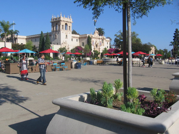 In June 2013, the first wave of improvements set in motion by Mayor Filner removed unsightly parking from the Plaza de Panama. Some tables and chairs were added, but a large area between the beautiful fountain and the San Diego Museum of Art remained empty. Three weeks ago, under Mayor Faulconer, additional amenities appeared. Personally, I love the scattered reds and blues of the umbrellas, a color scheme which I find very tasteful. Plaza de Panama is now a suitably dynamic and welcoming outdoor public space.