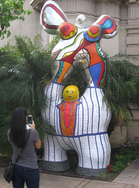 It seems everybody loves these two colorful sculptures located near the entrance of Balboa Park’s Mingei Museum. They were created by world-famous Franco-American artist Niki de Saint Phalle, whose fanciful works can be seen in a few different San Diego locations. Earlier this year I posted some pics of her Coming Together sculpture near the San Diego Convention Center.
