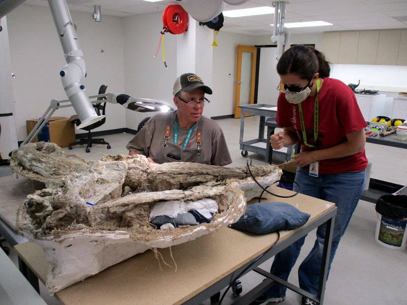 Today, down in the San Diego Natural History Museum’s basement Paleo Center, Mary was working on a fossil found in Mission Valley.