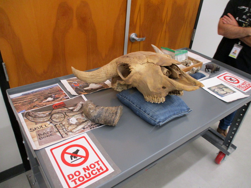 Visitors peering through the Paleo Center window could watch her as she removed tiny bits of sandstone from the partial skull (with horn cores and cervical vertebrae) of a Bison Latifrons, found in Ice Age stream deposits, and dating from 100,000 years ago.