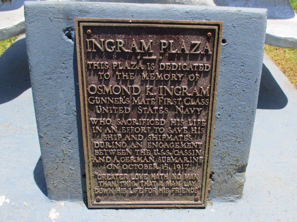 THIS PLAZA IS DEDICATED TO THE MEMORY OF OSMOND K. INGRAM, GUNNER’S MATE FIRST CLASS UNITED STATES NAVY, WHO SACRIFICED HIS LIFE IN AN EFFORT TO SAVE HIS SHIP AND SHIPMATES DURING AN ENGAGEMENT BETWEEN THE U.S.S. CASSIN AND A GERMAN SUBMARINE ON OCTOBER 15, 1917. “GREATER LOVE HATH NO MAN THAN THIS, THAT A MAN LAY DOWN HIS LIFE FOR HIS FRIENDS.”
